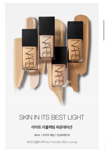나스 라이트 리플렉팅 파운데이션은 정말 놀라운 질감과 피부 표현력을 가진 제품이에요. 파운데이션을 했다는 느낌이 전혀 들지 않을 정도로 얇고 투명하게 비치듯이 표현돼요. 피부 결이 살짝 빛나면서도 내 피부 같은 자연스러운 광을 연출할 수 있어요. 올리브영 파운데이션과는 또 다른 고급스러운 느낌을 줘요. 자연스러운 피부 표현을 원하면서도 광채를 포기할 수 없는 분들에게 강력 추천해요.
